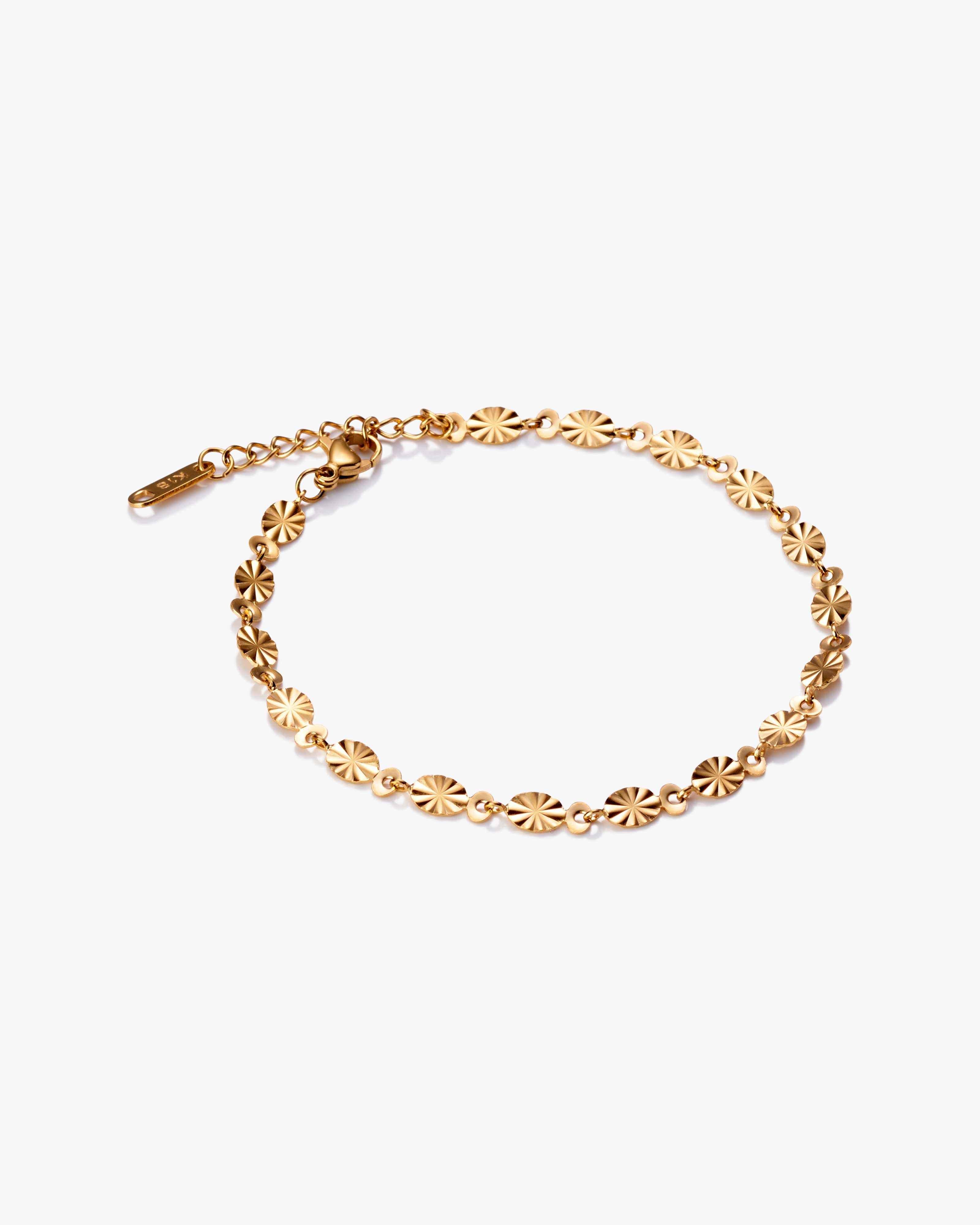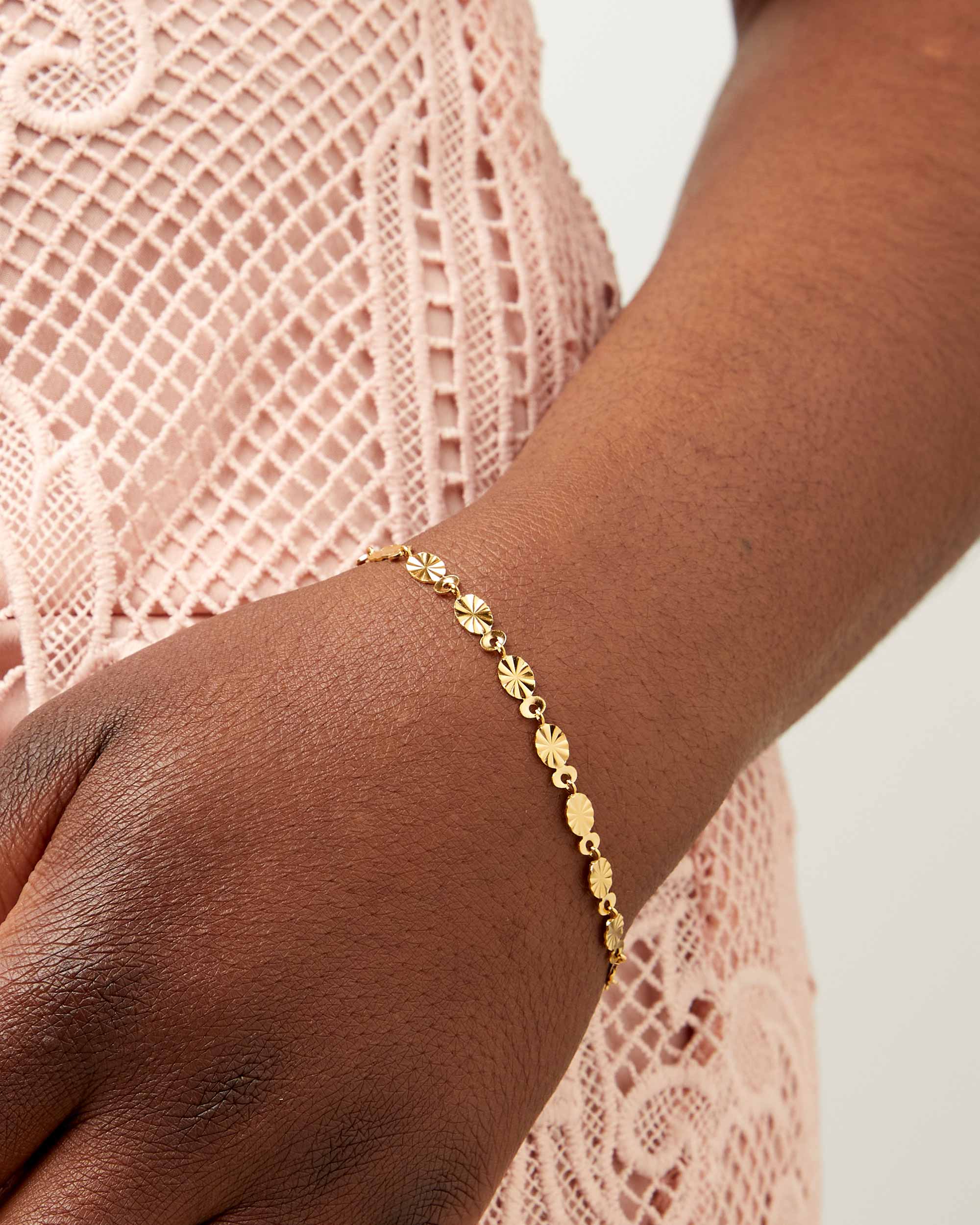 Our Gold Sunray Bracelet is crafted using the best quality materials to ensure it stands the test of time. This water-resistance, tarnish-free bracelet will keep shining, just like the sun, for years to come. The bracelet is made of sixteen oval-shaped discs which feature a line pattern all bursting from the centre of the oval. Each oval has a small flat loop at one end that sits flat with the main disc and the other end has a small hoop that attaches to the flat loop. Each loop allows the bracelet to move freely along your wrist and provides flexibility whilst wearing the bracelet throughout the day. The bracelet can be attached at the end with a classic trigger clasp fastening. A traditional link chain at one end allows you to adjust the length of the bracelet for a better fit.